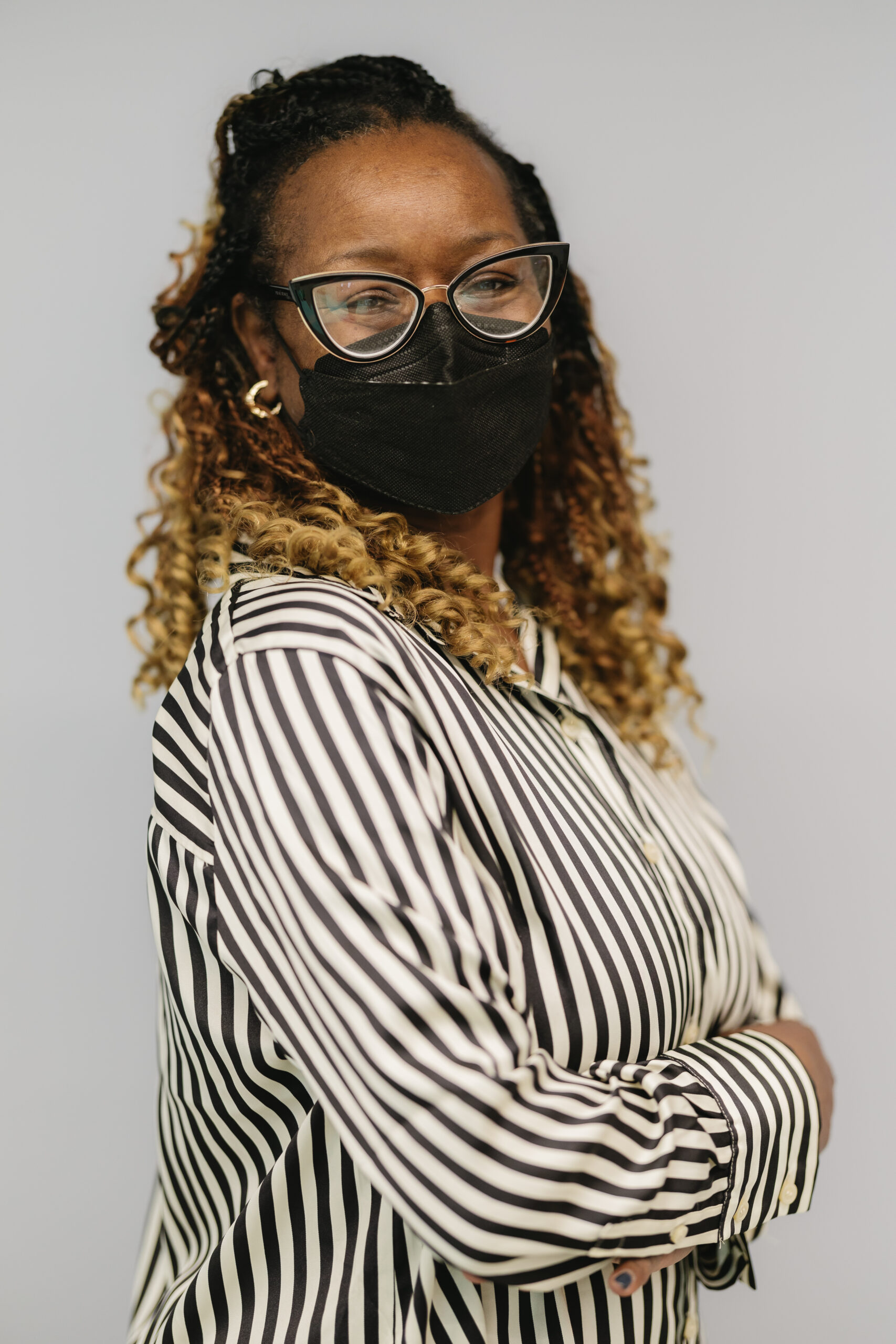 Headshot of Keisheona, a woman with  light brown skin, hair braided back in two braids, wearing black framed glasses, and a navy blue and white horizontal stripe shirt.